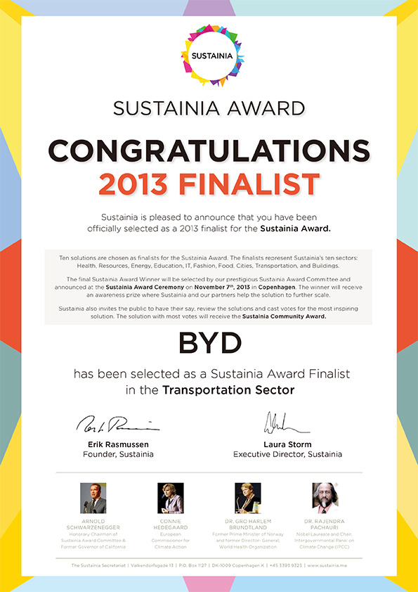 International institute Sustainia has launched its top-10 list of best sustainable innovations for 2013 that will compete for the prestigious Sustainia Award later this year. BYD ebus has been selected as a 2013 finalist and was presented to business leaders from around the world at the UN business conference Leaders Summit in New York on September 19th. The 10 companies and projects have