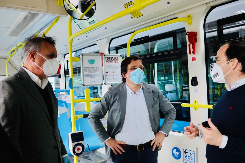 Onboard a BYD 12-metre eBus – From left to right: Mr. Alfonso Sánchez Vicente, Manager at EMT Madrid; Mr. José Luis Martínez Ameida, Mayor of Madrid; Mr. Borja Carabante Muntada, Councilor for Mobility [Picture Source: Ayuntamiento de Madrid]